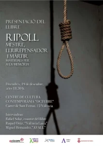 Presentació del llibre: RIPOLL mestre, lliurepensador i màrtir: Materials per a la memòria. Divendres 19/12/2025 CCC OCTUBRE, 18.30h.